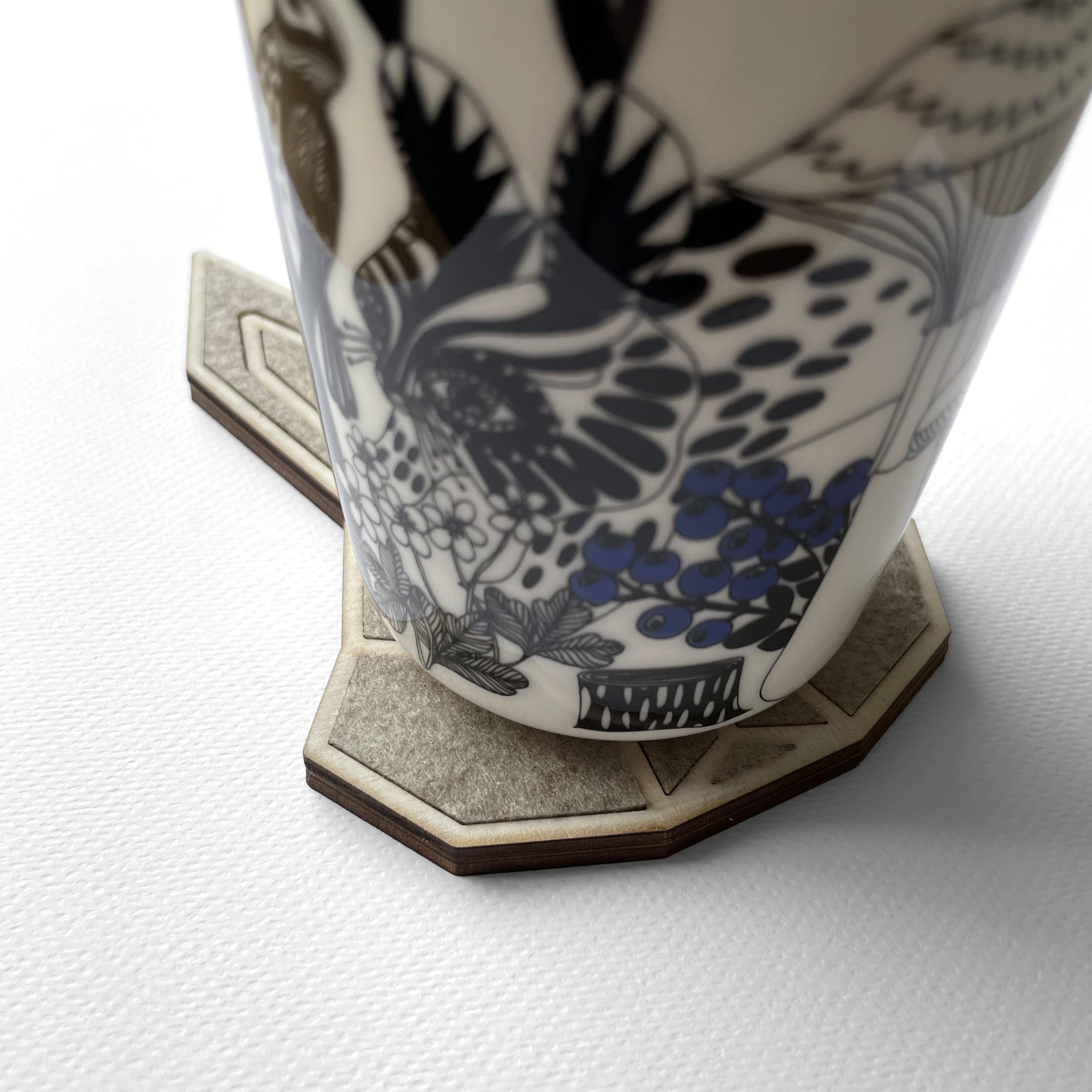 Pannunalunen on valmistettu kestävästä kotimaisesta koivuvanerista ja pehmeästä huovasta. Tämä yhdistelmä tekee mukinalusesta helpon käyttää. Se sopii täydellisesti kupille, mutta sopii myös erinomaisesti muiden pienten keittiövälineiden alle.