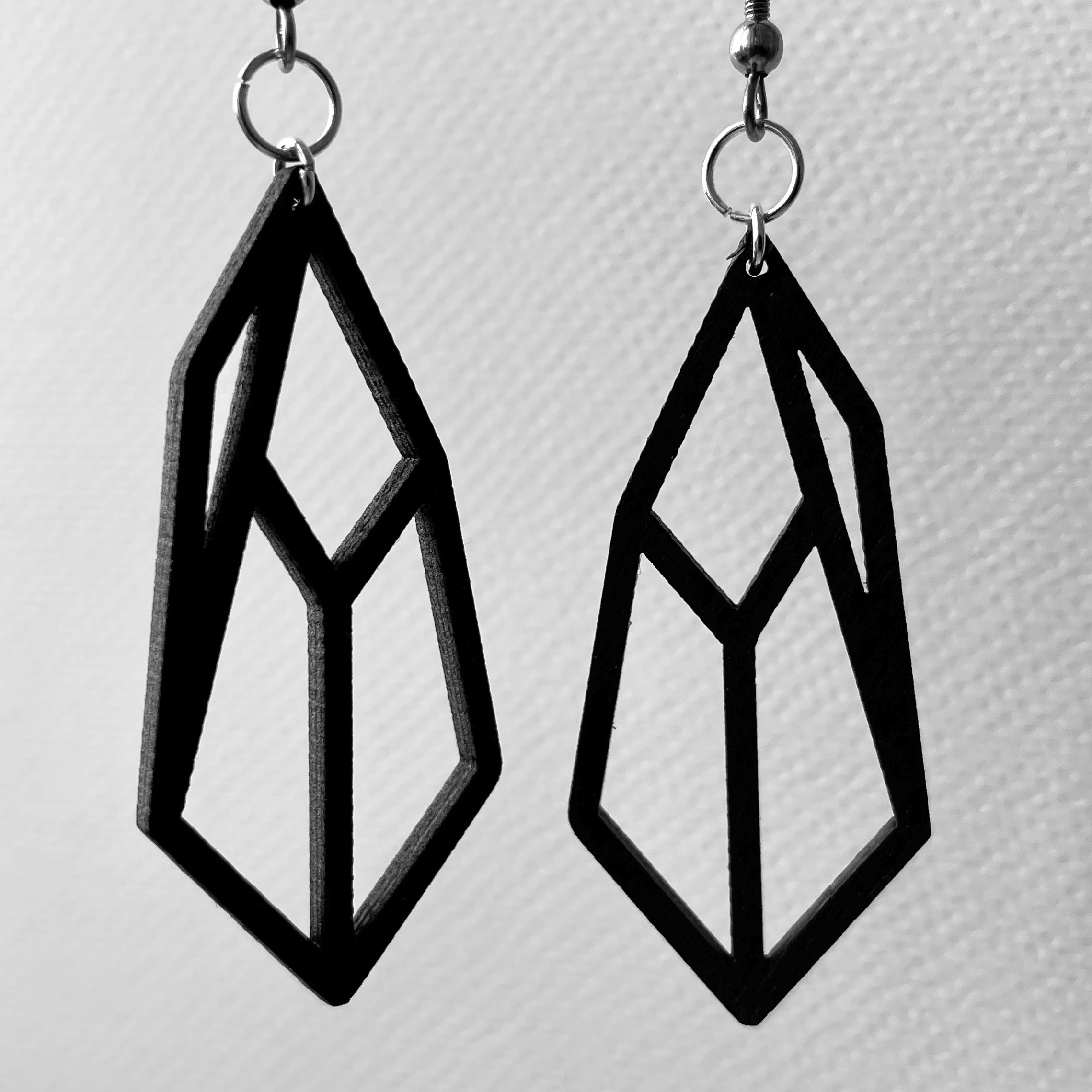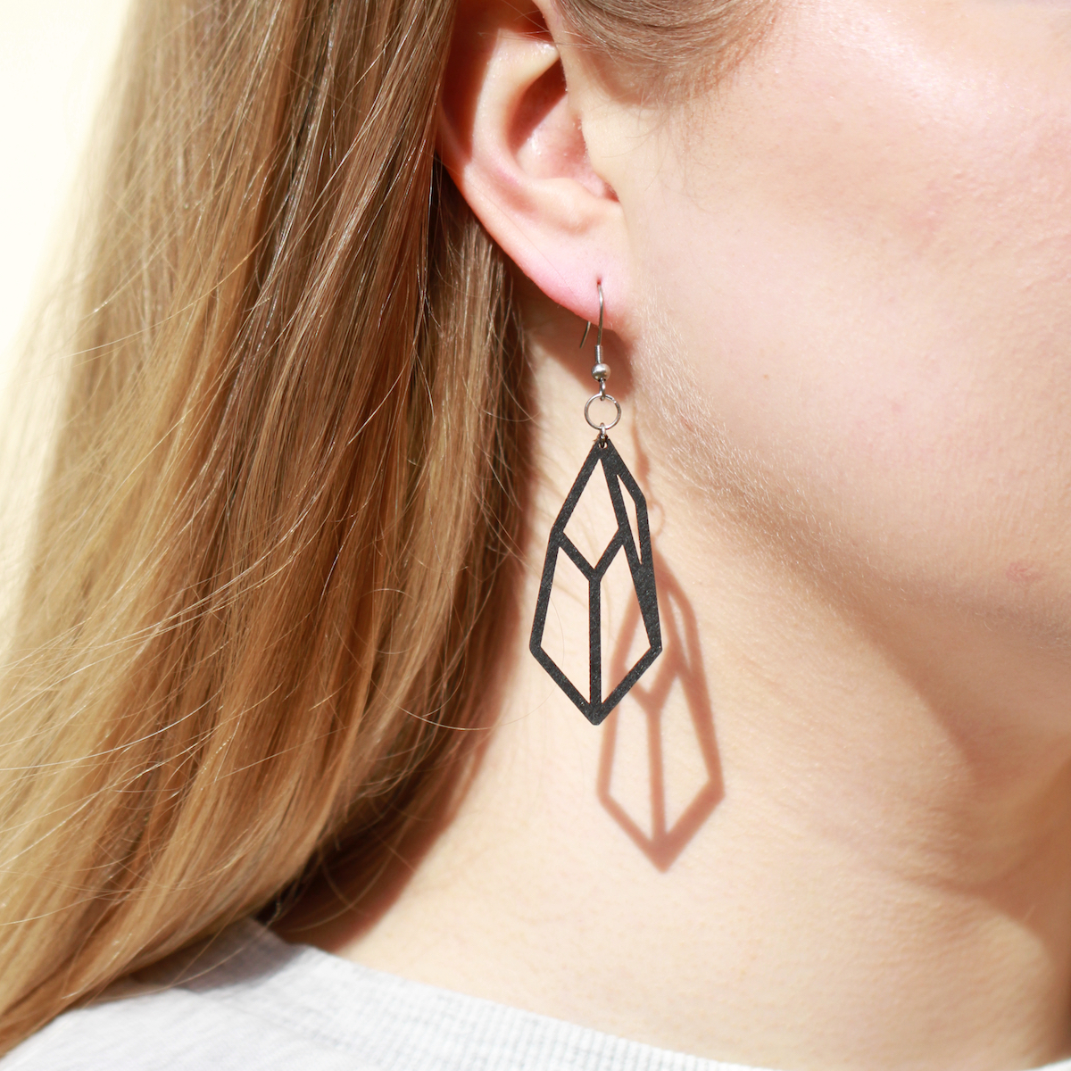 Tämä upea korvakoru on valmistettu mustaksi petsatusta kotimaisesta koivuvanerista, jonka muoto on saanut inspiraation luonnossa esiintyvistä kivimuodostelmista.